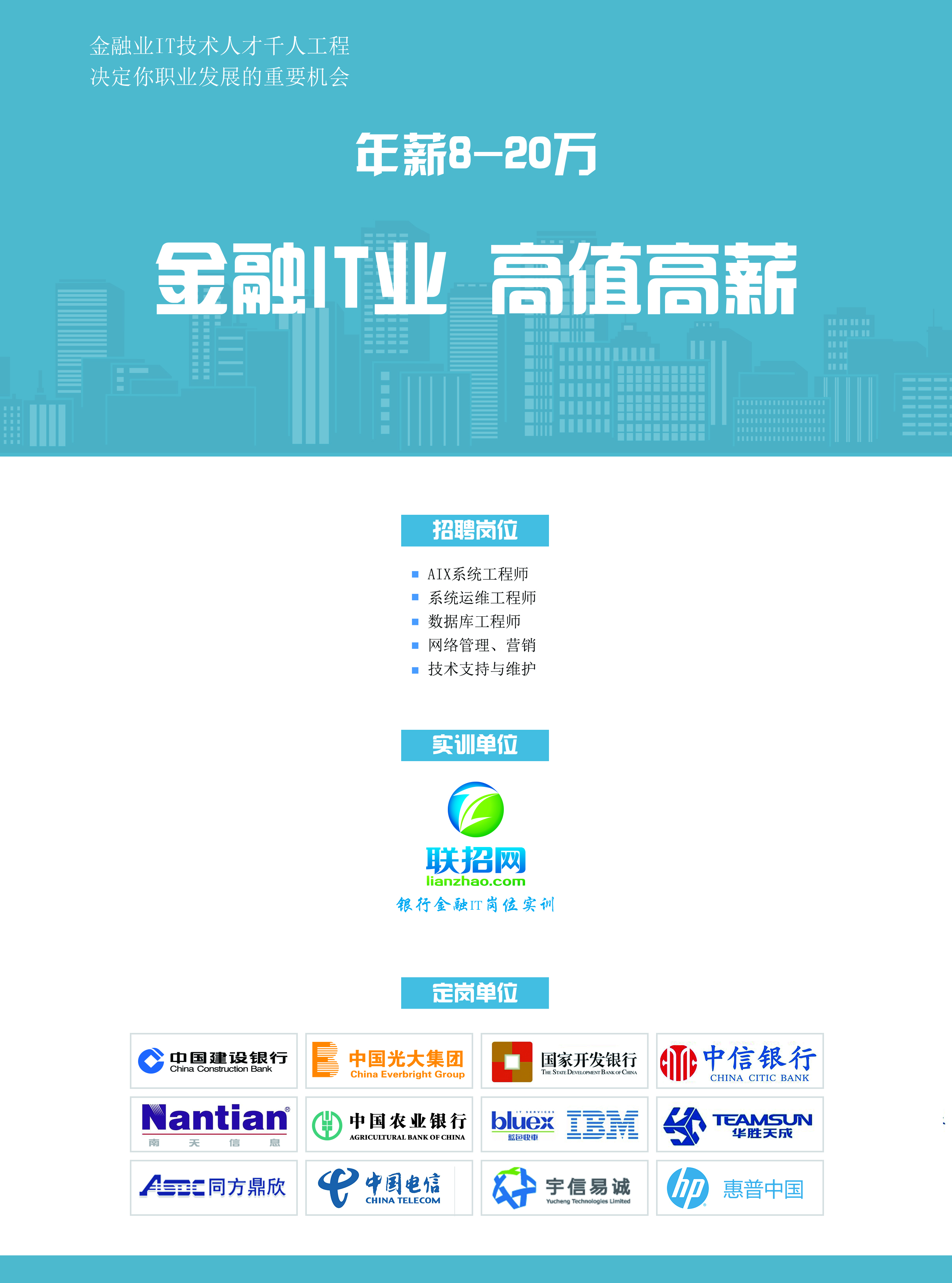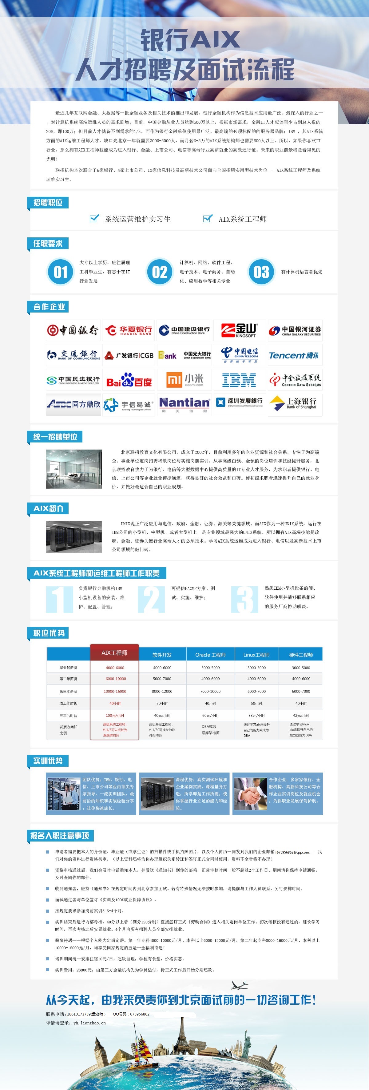 AIX系统工程师是银行、金融机构高级it岗位;发展前景大,工作年限越长,工资涨得越高,本次招聘机会难得,计划不多;实习生可以零基础!选择比努力更重要!机会就在眼前!
