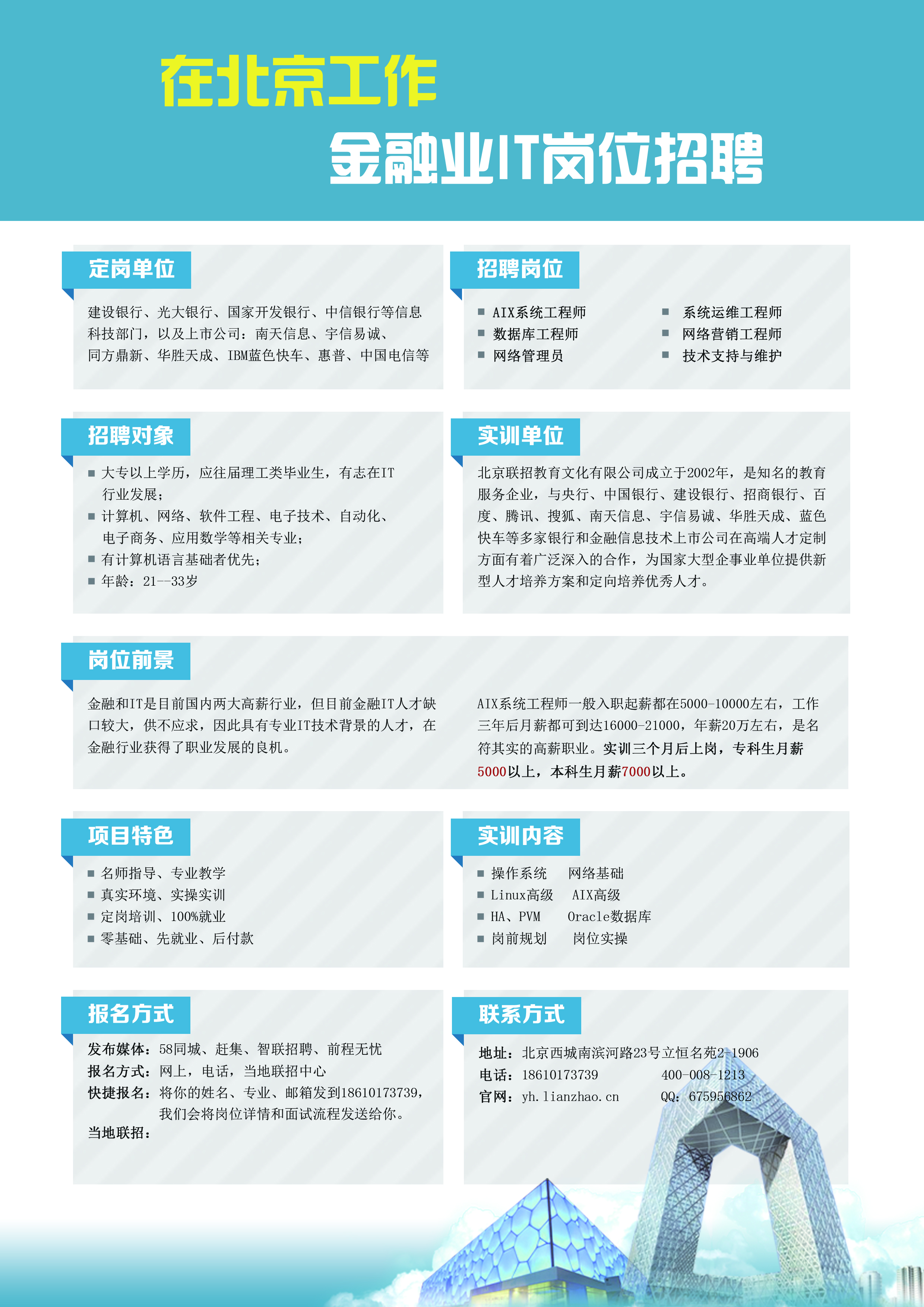 5、工作地点:北京市区范围内各大银行、金融机构及高新企业上市公司