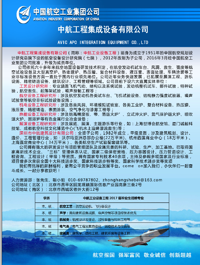 【就业】本科及以上-中航工程集成设备有限公司2017年应届毕业生招聘简章